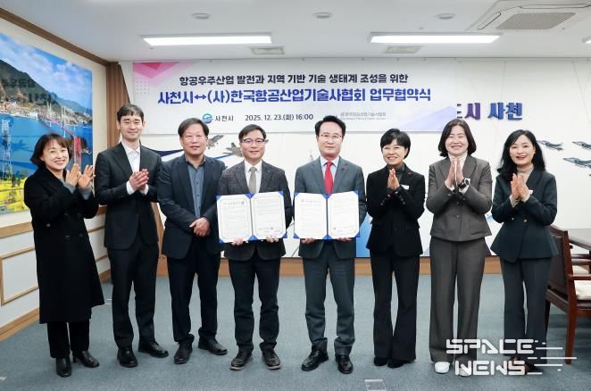 스페이스뉴스 스페이스뉴스 기자 | 사천시는 지난 23일 시청 열린시장실에서 사단법인 한국항공산업기술사협회와 항공우주산업 발전과 지역 기반 기술 생태계 조성을 위한 업무협약(MOU)을 체결했다.