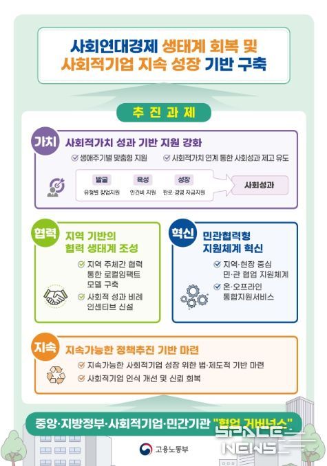 스페이스뉴스 스페이스뉴스 기자 | 고용노동부는 가치, 협력, 혁신, 지속가능성을 기본전략으로 제시하고 사회적기업 생태계 회복과 지속가능한 성장 기반 구축에 본격적으로 나선다.
