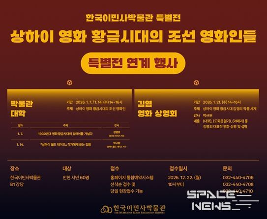 스페이스뉴스 스페이스뉴스 기자 | 인천광역시 시립박물관 분관 한국이민사박물관은 특별전 〈상하이 영화 황금시대의 조선 영화인들〉과 연계해 유명 작가 초청 특강을 개최한다고 밝혔다.