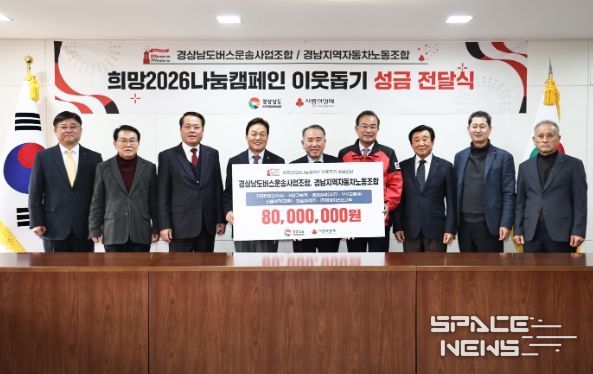 스페이스뉴스 스페이스뉴스 기자 | 경상남도는 29일 도청 소회의실에서 경남버스운송사업조합(이사장 양기환)과 경남지역자동차노동조합(위원장 박지훈)이 도내 취약계층을 돕기 위한 성금 8천만 원을 전달했다고 밝혔다.