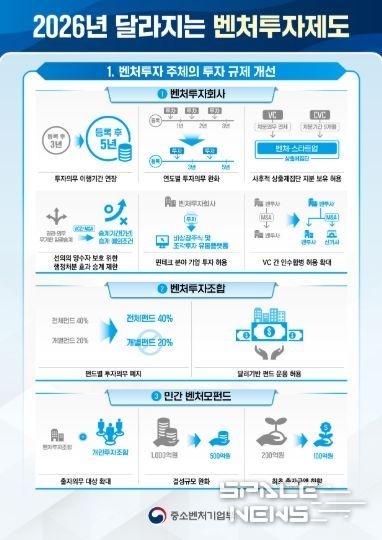 스페이스뉴스 스페이스뉴스 기자 | 중소벤처기업부는 「벤처투자 촉진에 관한 법률」 및 하위법령(시행령, 시행규칙) 개정을 바탕으로 ’26년에 새롭게 달라지는 벤처투자 제도를 발표했다고 밝혔다.