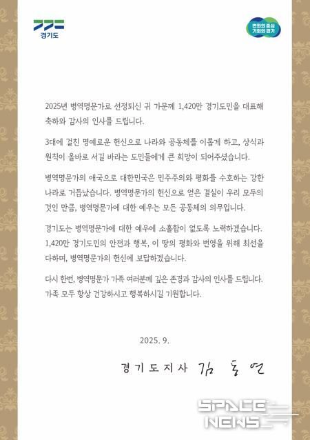 김동연 경기도지사는 서한문을 통해 “병역명문가의 애국으로 대한민국은 민주주의와 평화를 수호하는 강한 나라로 거듭났다”면서 “경기도는 병역명문가에 대한 예우에 소홀함이 없도록 노력하겠으며, 헌신에 보답하겠다”고 감사와 존경의 뜻을 표현했다.