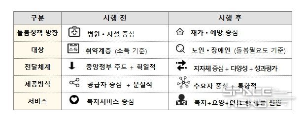 또한, 개별 사업별로 따로 신청하고 관리하던 구조에서, 시군구가 대상자의 돌봄 필요도를 파악하여 통합지원회의를 통해 계획을 세우고 서비스를 연계하는 수요자 중심 지원 체계로 전환된다.