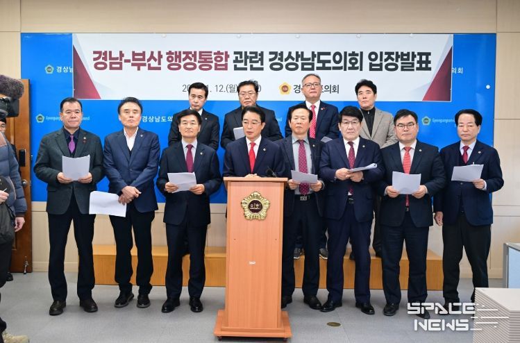 스페이스뉴스 스페이스뉴스 기자 | 경상남도의회는 1월 12일, 도의회 브리핑룸에서 기자회견을 열고, 현재 추진 중인 경남·부산 행정통합 논의와 관련해 통합의 방향성에는 공감하되, 성급한 추진에 대해서는 신중한 접근이 필요하다는 공식 입장을 밝혔다.
