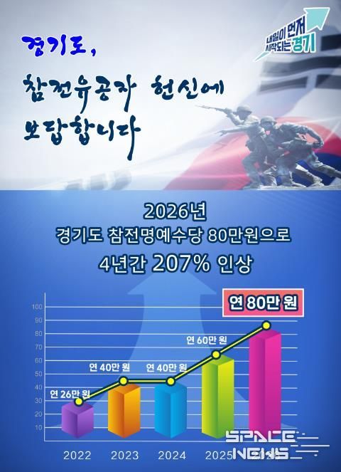 스페이스뉴스 스페이스뉴스 기자 | 경기도가 참전유공자에 대한 예우를 강화하기 위해 2026년 경기도 참전명예수당을 연 80만 원으로 인상했다.