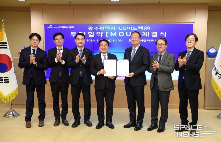 스페이스뉴스 스페이스뉴스 기자 | 광주광역시와 LG이노텍은 13일 시청 비즈니스룸에서 ‘차량용 제어모듈 신규 생산라인 구축을 위한 투자협약’을 체결했다. 이번 협약은 2026년 새해 부강한 광주로의 힘찬 도약을 알리는 첫 신호탄이다.