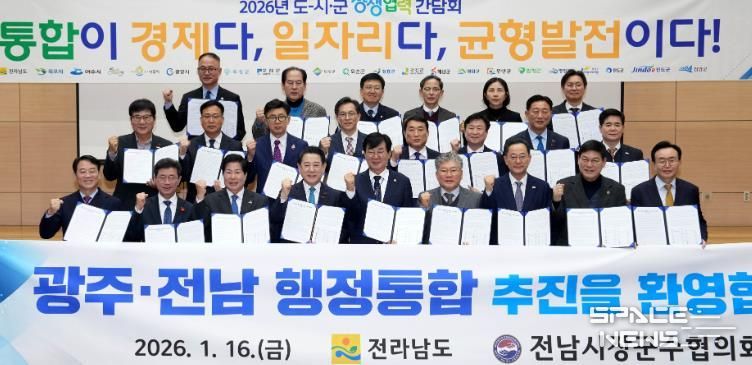 스페이스뉴스 스페이스뉴스 기자 | 전라남도는 16일 전남도청 왕인실에서 ‘2026년 도-시군 상생협력 간담회’를 열어 지역 대도약을 위한 광주·전남 행정통합 추진에 도와 22개 시군이 공동 보조를 맞추기로 했다.