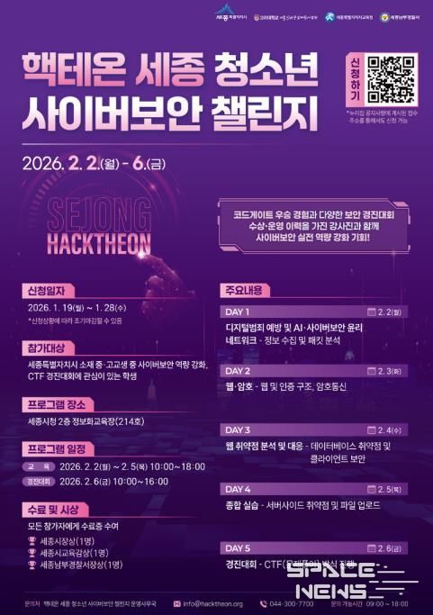세종특별자치시는 오는 28일까지 관내 중고등학생을 대상으로 핵테온 세종 청소년 사이버보안 챌린지 참가자를 모집한다고 밝혔다.