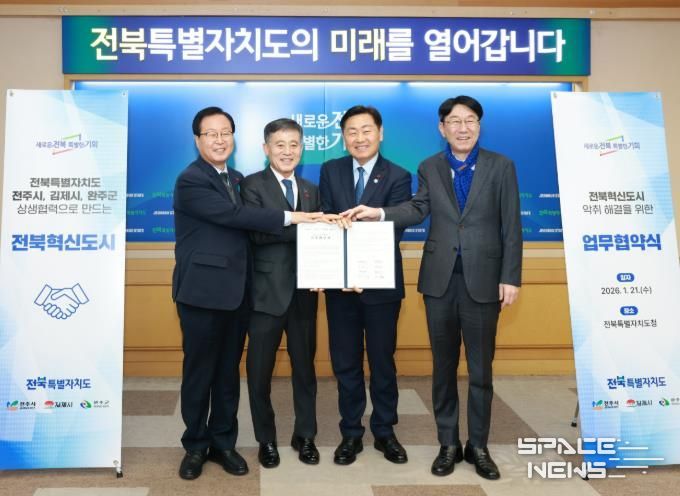 스페이스뉴스 스페이스뉴스 기자 | 완주군이 21일 전북특별자치도청에서 전북특별자치도, 전주시, 김제시와 함께 혁신도시 악취 문제 해결을 위한 업무협약을 체결했다.