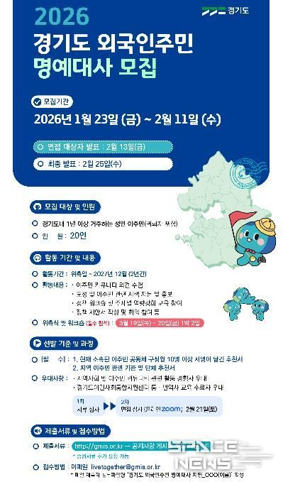 스페이스뉴스 스페이스뉴스 기자 | 경기도가 오는 2월 10일까지 ‘경기도 외국인주민 대사’ 20명을 모집한다.