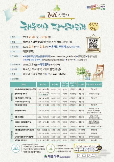 스페이스뉴스 스페이스뉴스 기자 | 해운대구는 지역 주민의 평생학습 참여 확대를 위해 2026년 평생학습관 상반기 프로그램 수강생을 모집한다.