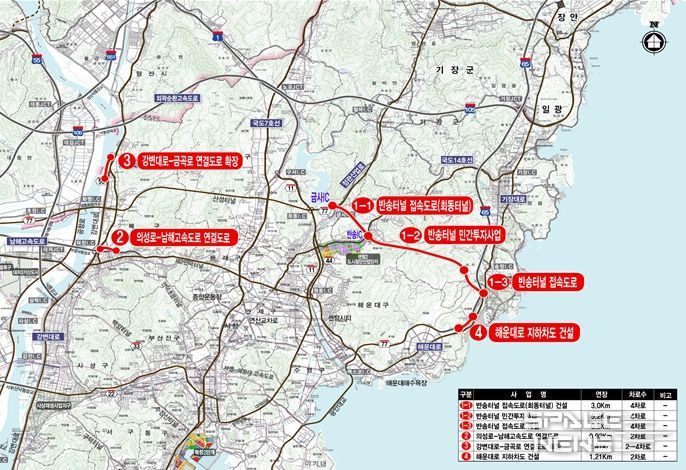4개 사업은 총 6천539억 원 규모로, ▲반송터널 ▲의성로~남해고속도로 연결도로 ▲강변대로~금곡로 연결도로 확장 ▲해운대로 지하차도 건설 사업이다.