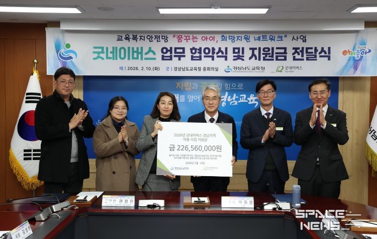 스페이스뉴스 스페이스뉴스 기자 | 경상남도교육청은 10일 본청 중회의실에서 굿네이버스 경남사업본부와 업무 협약을 맺고 지원금 전달식을 열었다. 이번 행사는 교육복지안전망인 ‘꿈꾸는 아이, 희망지원 네트워크’ 사업의 하나로 마련했다.