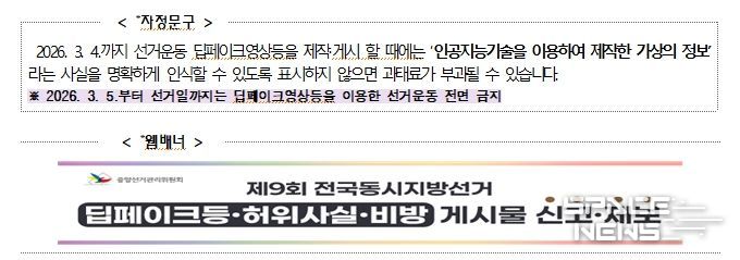 포털사 뉴스 댓글창, 인터넷 커뮤니티, AI사 홈페이지 등에'공직선거법'안내 자정문구를 표출하여 온라인 자율 규제 유도를 통해 위법행위를 사전에 예방하는 한편,주요 포털사와 인터넷 커뮤니티 홈페이지 등에 웹배너를 게시하여 위법게시물 신고·제보도 활성화한다.