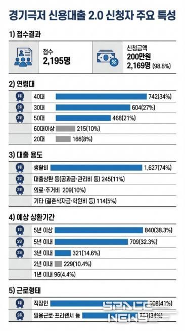 경기도는 지난 2월 11일 마감한 ‘경기 극저신용대출 2.0’ 신청자 2,195명을 분석한 결과 신청자의 74%(1,627명)가 대출 용도를 ‘생활비’라고 밝히는 등 금융취약계층의 생계유지와 채무 부담 해소를 위해 금융 지원이 절실한 것으로 나타났다고 20일 밝혔다.