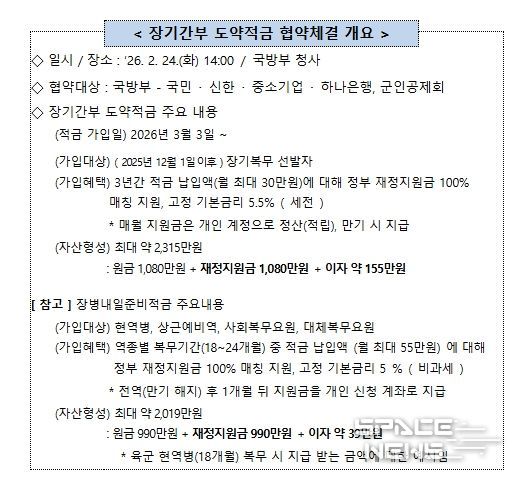 안규백 국방부장관 주관으로 2월 24일, 국방부 청사에서 국민은행, 신한은행, 중소기업은행, 하나은행, 군인공제회와 ‘장기간부 도약적금’ 업무협약을 체결하고, 협약 이행을 위해 상호 긴밀히 협력할 것을 약속했다.