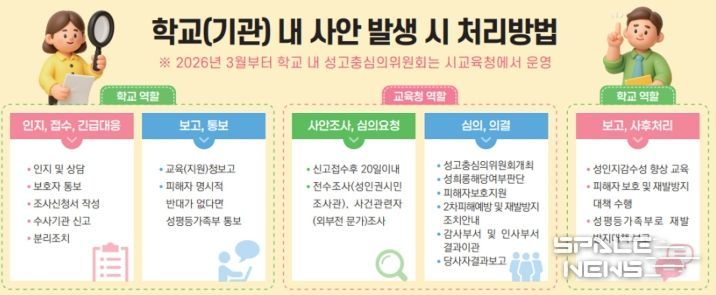 이를 통해 학교는 성고충심의위원회 운영에 따른 갈등과 업무부담에서 벗어나 성폭력예방·재발방지 교육 등에 집중할 수 있게 될 전망이다.