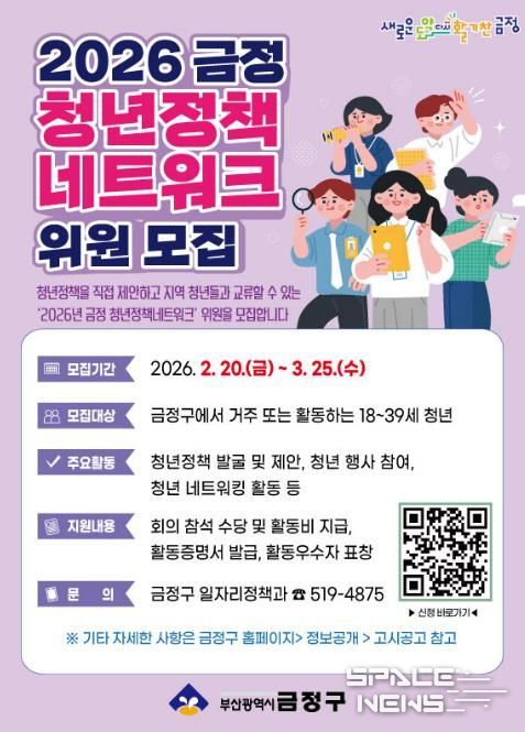 스페이스뉴스 스페이스뉴스 기자 | 부산 금정구는 2월 20일부터 3월 25일까지 2026 금정 청년정책네트워크 위원을 모집한다.