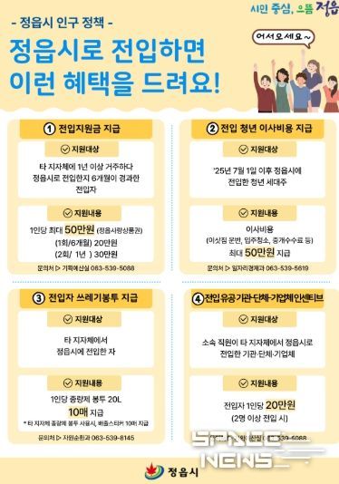 먼저 시는 타 지자체에서 정읍으로 터전을 옮기는 시민들을 위해 전입지원금을 대폭 상향했다. 기존 15만원이었던 지원금을 최대 50만원으로 확대해 전입 후 6개월이 지나면 20만원, 1년이 경과하면 30만원 등 총 2회에 걸쳐 정읍사랑상품권으로 지급한다. 변경된 제도는 2025년 7월 1일 이후 전입자부터 적용된다.