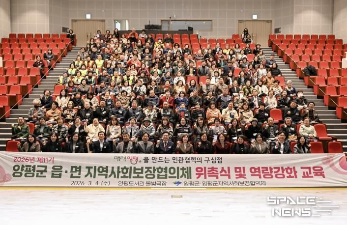 스페이스뉴스 스페이스뉴스 기자 | 양평군은 지난 4일 양평도서관 물빛극장에서 250여 명이 참석한 가운데 ‘2026년 제11기 읍면 지역사회보장협의체 위촉식 및 역량 강화 교육’을 개최하고, 지역 맞춤형 복지안전망 강화를 위한 본격적인 활동에 들어갔다고 밝혔다.