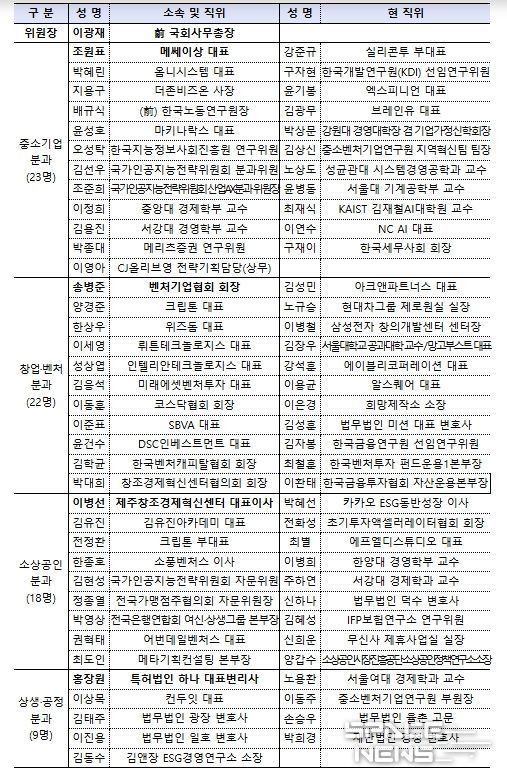민관 정책협의회는 기업인, 민간 전문가, 학계, VC, 협·단체 등 총 72명의 위원으로 구성되어 출범일로부터 1년간 활동하게 된다. 또한 한성숙 중기부 장관과 이광재 전 국회사무총장이 공동위원장을 맡아 민관 정책협의회를 이끌어갈 예정이다.