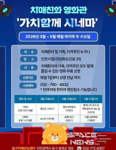 스페이스뉴스 스페이스뉴스 기자 | 인천 동구는 치매환자와 가족, 지역주민이 문화를 향유 할 수 있는 치매친화 영화관 ‘가치함께 시네마’를 오는 3월~5월까지 매월 마지막 주 수요일 운영한다고 밝혔다.