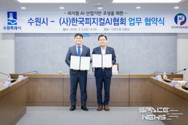 스페이스뉴스 스페이스뉴스 기자 | 수원특례시와 (사)한국피지컬에이아이(AI)협회는 6일 시청 상황실에서 업무협약을 체결하고, 피지컬 인공지능(AI) 산업 활성화를 위해 적극적으로 협력하기로 했다.