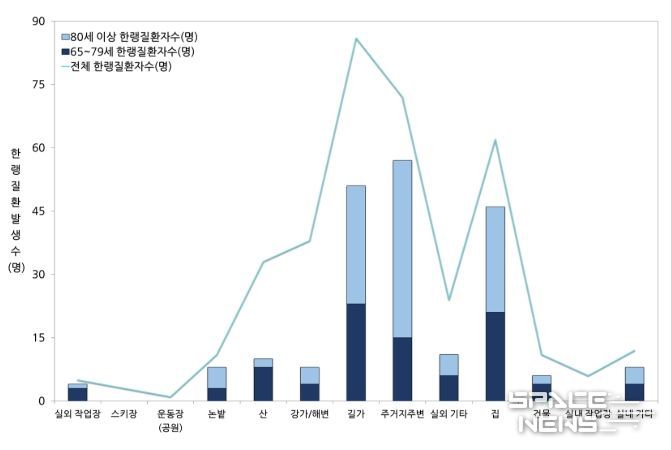 발생 연령과 발생 장소의 연관성을 비교해 보면, 가장 많은 한랭질환자 발생 분포를 띄는 65세 이상 연령층(209명)의 주요 증상 발생 장소가 주거지 주변(27.3%, 57명), 길가(24.4%, 51명), 집(22.0%, 46명)으로, 노년층의 일상생활 속 한랭질환 예방이 중요함을 나타내고 있다.