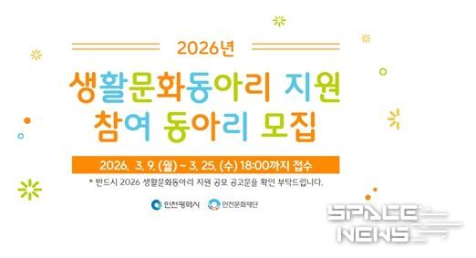 스페이스뉴스 스페이스뉴스 기자 | 인천광역시와 인천문화재단은 인천 시민들의 자발적인 문화예술 활동을 지원하기 위해 '2026 생활문화동아리 지원' 사업을 추진한다.