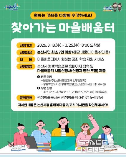 스페이스뉴스 스페이스뉴스 기자 | 논산시는 오는 25일까지 시민이 직접 배우고 싶은 강좌를 제안하고 마을에서 함께 배우는 ‘시민제안 찾아가는 마을배움터 사업’희망강좌를 모집한다.
