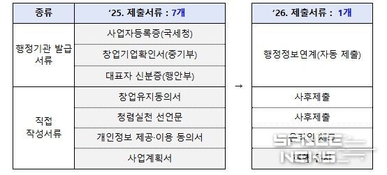 행정정보 연결로 사업자등록증, 재무제표 등 행정서류는 자동수집한다. 개인정보제공동의서 등은 온라인 체크로 대체한다. 또한, 기업 심사에 불필요한 서류는 폐지하거나 선정된 기업만 제출한다. 사업계획서 제한 분량도 평균 14장에서 9.4장까지 30% 이상 감축할 계획이다.