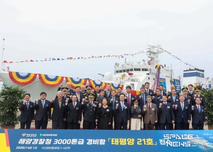 스페이스뉴스 스페이스뉴스 기자 | 해양경찰청은 4월 1일, 울산광역시 동구에 소재한 HD현대중공업㈜에서 3000톤급 신형 경비함 태평양 21호(3021함)의 진수식을 개최했다.