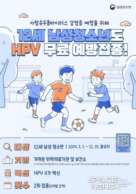 스페이스뉴스 스페이스뉴스 기자 | 질병관리청은 2026년 5월 6일부터 12세 남성 청소년(2014년생)을 대상으로 사람유두종바이러스(Human Papillomavirus, HPV) 백신 국가예방접종 지원사업을 새롭게 시행한다.