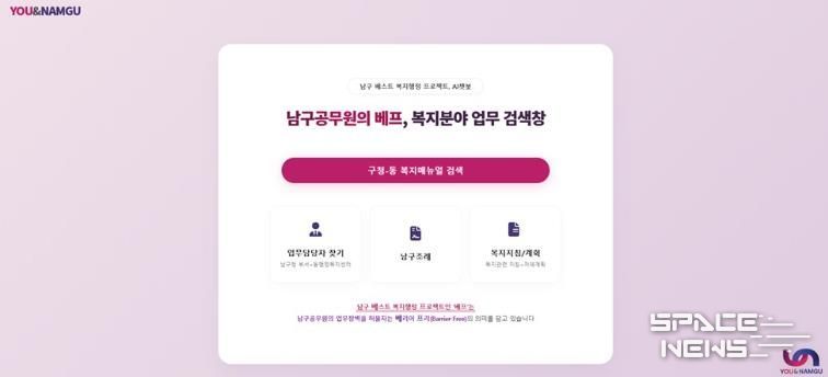 스페이스뉴스 스페이스뉴스 기자 | 부산 남구는 복지행정의 업무 효율성을 높이고 민원 응대 품질을 개선하기 위해 남구 베스트 복지행정 프로젝트인 ‘베프 AI챗봇’을 4월 중 구축하고 시범운영을 시작했다고 밝혔다.