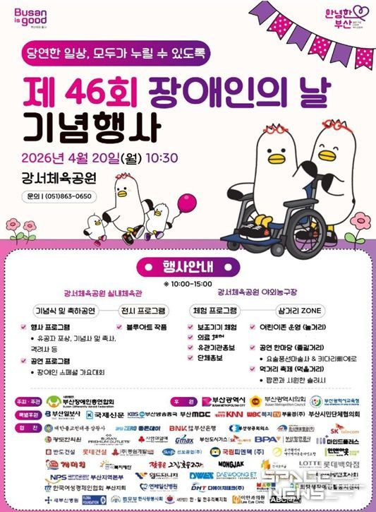 시가 후원하고, (사)부산장애인총연합회가 주최·주관하는 이번 행사에는 박형준 시장과 이종환 시의회 부의장, 김석준 시교육감을 비롯한 내외빈과 장애인·가족·특수학교 학생 등 5천여 명이 참석할 예정이다.