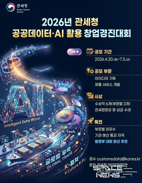 스페이스뉴스 스페이스뉴스 기자 | 관세청은 공공데이터로 개방된 관세무역데이터에 인공지능 기술을 활용한 혁신적인 창업아이디어를 발굴·지원하기 위해 4월 20일부터 '2026년 관세청 공공데이터·인공지능(AI) 활용 창업경진대회'를 개최한다.