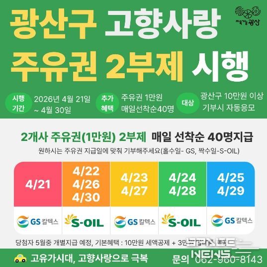 스페이스뉴스 스페이스뉴스 기자 | 광산구는 지속적인 고향사랑기부 참여를 확대하고 기부자에게 추가 혜택을 제공하기 위해 ‘주유권 2부제 행사’를 마련했다.