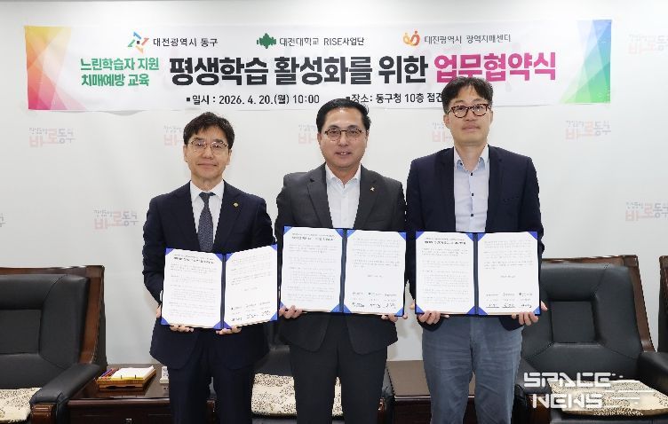 스페이스뉴스 스페이스뉴스 기자 | 대전 동구는 20일 대전대학교 RISE사업단‧대전시치매센터와 ‘느린학습자 평생교육 지원’과 ‘치매예방 프로그램 운영’을 위한 업무협약을 체결했다고 밝혔다.