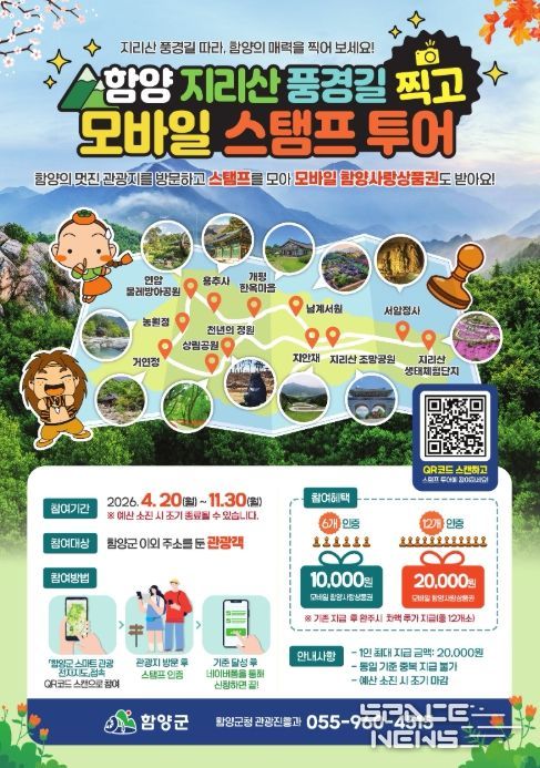 스페이스뉴스 스페이스뉴스 기자 | 함양군은 함양의 대표 관광자원을 보다 쉽고 재미있게 즐길 수 있도록, 관광객 참여형 이벤트인 ‘함양 지리산 풍경길 찍고 모바일 스탬프 투어’를 운영한다고 밝혔다.