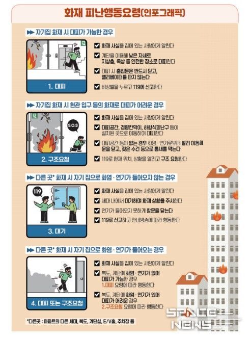 스페이스뉴스 스페이스뉴스 기자 | 소방청은 최근 아파트 화재가 잇따라 발생함에 따라, 인명피해를 최소화하기 위해 무리한 대피보다는 화재 상황을 먼저 판단하고 행동하는 상황별 피난 행동요령을 철저히 준수해 줄 것을 당부한다고 17일 밝혔다.