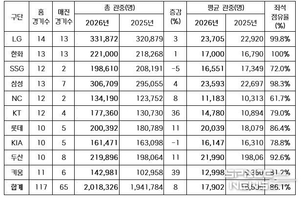 스페이스뉴스 스페이스뉴스 기자 | 2026 신한 SOL KBO 리그가 오늘(25일) 열린 잠실, 문학, 광주, 고척, 대전 경기에서 총 9만 9,905명이 입장하며 200만 관중을 달성했다.