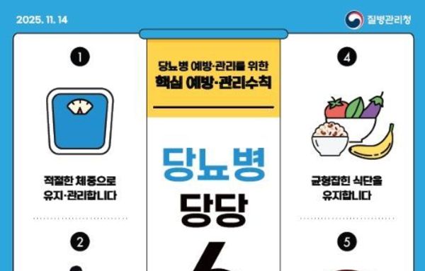 스페이스뉴스 스페이스뉴스 기자 | 질병관리청은 세계 당뇨병의 날을 맞아, 6대 당뇨병 예방관리수칙 및 수칙별 실천지침을 발표하고, 생활 속 실천을 통한 건강생활 습관 형성의 중요성을 당부했다.