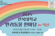 스페이스뉴스 스페이스뉴스 기자 | 반려동물과 시민이 함께 즐기는 축제가 반려동물 친화관광도시 익산에서 열린다. 익산시는 '2025 전북대학교 반려동물 한마당'이 오는 27일 오후 1시 전북대학교 익산특성화캠퍼스에서 다채롭게 펼쳐진다고 22일 밝혔다. 이번 행사는 전북대학교 수의과대학이 주최하며, 반려인과 시민 모두가 즐길 수 있는 풍성한 볼거리와 체험거리를 선보인다. 행사장에서는 △멍냥 그립톡 만들기 △발도장 추억액자 △반려동물 건강검진 등 체험 부스가 운영된다. 또 반려동물 산책룩 펫션쇼와 OX 퀴즈, 사진 콘테스트 등 무대 프로그램이 마련돼 현장 열기를 더한다. 아울러 전북대 수의과대학 박철 교수와 윤지선 교수의 강연으로 유익한 정보를 전달하고, '일일 수의사 체험'을 통해 미래 수의사를 꿈꾸는 청소년들에게 특별한 진로 경험도 제공한다. 방문객들에게는 리유저블백, 텀블러, 부채 등으로 구성된 기념 선물이 주어진다. 이 밖에도 부스별 스탬프 투어와 이벤트 무대 프로그램을 통해 제공되는 펫 드라이기, 자동 급식기, 강아지 유모차, 카시트 등 푸짐한 경품도 현장의