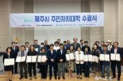 스페이스뉴스 스페이스뉴스 기자 | 현원돈 제주시 부시장은 27일 평생학습관 대강당에서 열린 ‘제4기 제주시 주민자치대학 수료식’에 참석해 교육과정을 마친 수료생들에게 축하의 인사를 전했다. 이날 수료식에서는 지난 6월부터 9월까지 4개월간 주민자치대학에서 ▲기본소양(지역문제 갈등관리 및 해결과정ㆍ제주 이해를 위한 미술관 속 세계여행), ▲지방자치(제주의 지속가능발전 목표ㆍ주민자치회 도입과 주민자치 우수사례 등), ▲실무역량(Chat GPT 이해와 주민자치 활용ㆍ주민자치 퍼실리데이터 교육 등), ▲워크숍 등의 교육을 이수한 33명에게 수료증이 전달됐다. 한편, 이번 주민자치대학은 (사)한국지역혁신연구원에 위탁해 제주특별자치도 소통협력센터에서 15주 동안 매주 목요일 오후 6시 30분부터 2시간 교육을 진행했다. 현원돈 제주시 부시장은 “이번 교육과정을 통해 습득한 지식과 경험이 지역사회 발전에 적극적으로 활용되길 바란다”며, “특히, 제주형 주민자치회 출범 등 주민자치의 새로운 방향을 모색하고 있는 시기에 여러분의 활동이 풀뿌리 민주주의 정착과 주민 주도 자치문화 확산에 큰 힘이 될 것이라 기대한다”고 전했다.