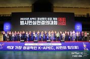 스페이스뉴스 스페이스뉴스 기자 | 경주시가 2025년 APEC 정상회의 개막을 한 달 앞두고 시민의 힘을 하나로 모아 성공개최 의지를 다졌다. 시는 30일 경주실내체육관에서 ‘2025년 APEC 정상회의 성공개최 범시민실천결의대회’를 성황리에 개최했다고 밝혔다. 이번 행사에는 APEC 범시도민지원협의회(공동회장 박몽룡·이상걸) 소속 회원을 비롯해 유관기관, 시민단체, 자원봉사자 등 경주시민 3천여 명이 참석해 시민과 함께하는 APEC의 진정한 의미를 되새겼다. 특히 주낙영 경주시장을 비롯해 김석기 국회 외교통일위원장, 이동협 경주시의장, 최병준 경북도의회 부의장을 비롯해 시·도의원 전원이 참석해 시민과 함께 손님맞이 실천 결의를 다지고 성공 개최를 향한 열기를 더했다. 행사장 내부에는 시민단체들이 자체 제작한 손님맞이 실천 결의 현수막이 곳곳에 걸려 있어, APEC 성공개최를 향한 시민들의 뜨거운 참여 의지를 생생하게 보여주었다. 본행사에 앞서 참석자들은 ‘APEC 시민 10대 실천과제’를 함께 되새기며, 모든 시민이 APEC의 주인으로서 행동할 때 성숙한 시민의식과 지속가능한 경주를