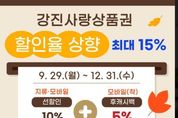 스페이스뉴스 스페이스뉴스 기자 | 강진군은 9월29일부터 12월31일까지 강진사랑상품권 할인율을 상향 조정한다고 24일 밝혔다. 추석 명절 맞이 및 지역경제 회복을 위해 마련된 할인 혜택은 지류 및 모바일(착) 강진사랑상품권 구매 시 선할인 10%이며, 기간 중 모바일(착) 사용 시 후캐시백 적립 5%로 총 15% 할인 혜택을 받을 수 있다. 구매 한도는 월 70만 원으로 동일하다. 다만, 모바일(착) 상품권 후캐시백은 매월 1억 원을 투입할 예정으로 예산소진 시 운영이 종료되므로 혜택을 받기 위해서는 빠르게 소비하는 것이 유리하다. 관내 모바일(착) 상품권은 음식점, 전통시장, 주유소, 미용실, 병원, 마트 등 지역 내 1,600여 개의 가맹점에서 사용할 수 있다. 자세한 가맹점 안내는 강진군 홈페이지 및 지역상품권 chak(앱) ‘가맹점 찾기’에서 확인할 수 있다. 모바일(착) 상품권 한 이용자는 “상품권을 충전할 때 10% 할인받는 것도 좋지만, 결제할 때마다 캐시백을 적립해 주니 쓰는 재미가 있어서 착을 더 이용한다”며 “명절 연휴뿐만 아니라 3개월동안 15% 할인혜