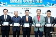 스페이스뉴스 스페이스뉴스 기자 | 전라남도는 24일 도청 서재필실에서 ㈜성경식품, ㈜해진수산, ㈜해진식품 등 3개사와 투자금액 총 1천34억 원 규모의 투자협약을 했다고 밝혔다. 이번 투자로 302명의 신규 고용 창출도 기대된다. 이날 협약식에는 김영록 전남도지사를 비롯해 육현진 ㈜성경식품 대표, 김성윤 ㈜거해 대표, 임한택 ㈜해진수산·㈜해진식품 대표, 김희수 진도군수, 윤재광 영암부군수 등이 참석했다. ㈜성경식품은 자반김 전문업체 ㈜거해와 합작해 500억 원을 투자, 진도 군내농공단지에 생산시설을 구축한다. 최첨단 설비와 스마트 자동화 공정을 도입해 강화된 글로벌 위생 기준에 대응해 진도공장을 글로벌 수출 전진기지로 육성할 계획이다. 향후 조미김 등 완제품 가공 분야까지 투자 범위를 확대해 김 산업의 부가가치를 높여갈 예정이다. ㈜해진수산과 ㈜해진식품은 534억 원을 투입, 영암군에 마른김·조미김 생산라인을 구축한다. 해남에서 레미콘 기업을 운영해 온 임한택 대표의 식품산업 진출 사례로, 지역 내 식품 분야 투자 다각화를 촉진하는 모범 모델이 될 것으로 주목된다. &nbs