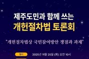스페이스뉴스 스페이스뉴스 기자 | 제주특별자치도의회, 제주특별자치도 주민자치위원회협의회, 제주대학교 리걸클리닉센터, 제주미래디자인포럼, 사회적협동조합 제주로 공동 주최로 11월 25일 오전 10시, 제주특별자치도의회 1층 대회의실에서 '제주도민과 함께 쓰는 개헌절차법 토론회'를 개최한다. 국민주권 시대에 국민이 주도하는 헌법 개정 요구가 커지고 있고 이에 시민의회 방안, 국민청원 방안, 추진협의회 방안 등 국민참여방안을 담은 개헌절차법안이 3건이 국회에 발의됐지만 3건 법안의 국민참여방안은 제주도민의 의견을 충분히 반영하기에는 미흡하다는 지적이 있음에따라 이번 토론회는 제주도민의 목소리가 실질적으로 담길 수 있는 개헌절차법 제정 방안을 깊이 있게 모색하기 위해 마련됐다. 토론회는 이상봉 제주특별자치도의회 의장의 인사말로 시작하여 이남근 제주특별자치도의회 의원이 좌장을 맡고 신용인 제주대학교 로스쿨 교수가 '개헌절차법상 국민참여 방안 쟁점과 과제'를 주제로 발표할 예정이다. 또한 고정학 제주특별자치도주민자치위원회협의회장, 신훈민 변호사, 양광수 아라동 주민자치위원장, 조현주 국민주도상생개헌행동 상임공동대표가 제주