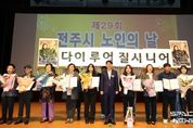 스페이스뉴스 스페이스뉴스 기자 | 100세 시대를 맞아 전주지역 노인들의 행복하고 건강한 노후생활을 함께 염원하는 노인의날 기념식이 열렸다. 전주시와 대한노인회 전주시지회(지회장 홍성언)는 14일 전주학생교육문화관 공연장에서 우범기 전주시장과 최주만 전주시의회 부의장, 김두봉 대한노인회 전북특별자치도연합회장, 표창 수상자 등 1200여 명이 참석한 가운데 ‘제29회 전주시 노인의날 기념식’을 가졌다. 송민주 대한노인회 전주시지회 사무국장의 사회로 진행된 이날 기념식은 △무지개예술자원봉사단(단장 고대현)과 아름다운 실버 전주의꽃(단장 김인식)의 식전 공연 △노인 강령 낭독 △청려장(장수지팡이) 수여 △전주시장 및 전주시의장 표창 수여식 △노인복지공로자에 대한 공로장 수여식 등의 순으로 진행됐다. 특히 우범기 전주시장은 이날 기념식에서 올해 100세를 맞이한 김옥순 어르신(여, 덕진동)에게 무병장수의 상징인 청려지팡이를 전달했으며, 홍성언 지회장은 축하의 꽃다발을 선물했다. 홍성언 대한노인회 전주시지회장은 “풍성했던 한가위도 지나가고, 땀과 노력으로 이뤄낸 결실의 계절 가을을 맞이해 참석해 주신 우범