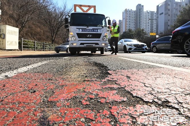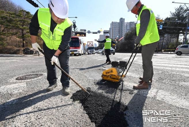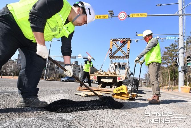 스페이스뉴스 스페이스뉴스 기자 | 지난 14일 오후 수원 영통구의 한 아파트 단지 앞 사거리. ‘도로 정비 공사 차량’이라는 스티커를 붙인 트럭 두 대가 나타났다. 형광색 조끼를 입은 작업자 3명이 트럭에서 내려 차량을 통제하고, 능숙한 동작으로 도로가 파인 부분을 메웠다.